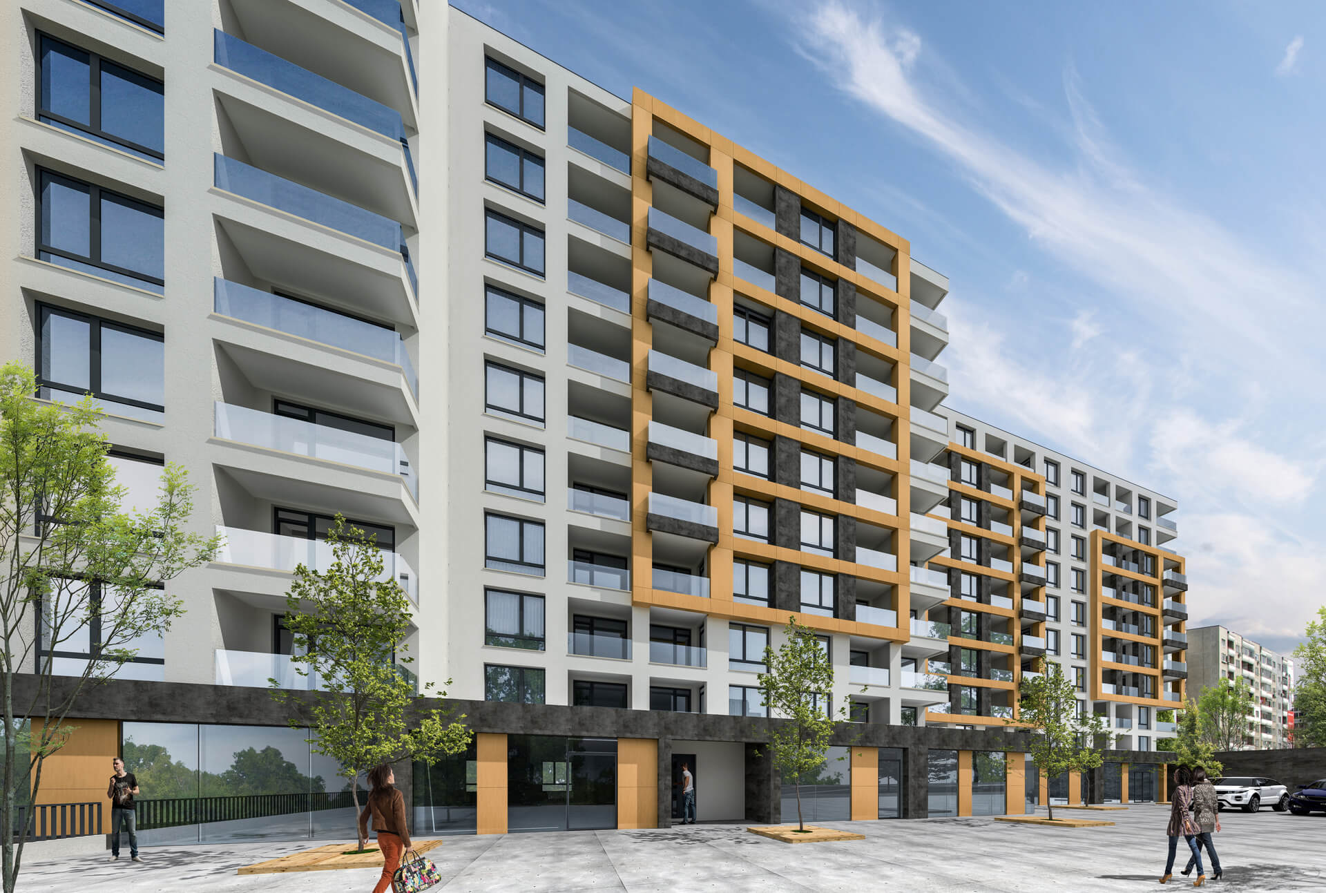 Фасадата на сградата е решена като комбинация от силикатна мазилка, еталбонд, HPL или керамика. Парапетите по всички балкони са стъкло триплекс. Предвидената дограма е PVC- 5 или 6 камерна REHAU или KÖMMERLING, със стъклопакет 6мм четири сезона, 4мм К стъкло, с двойно отваряне, подпрозоречни первази.