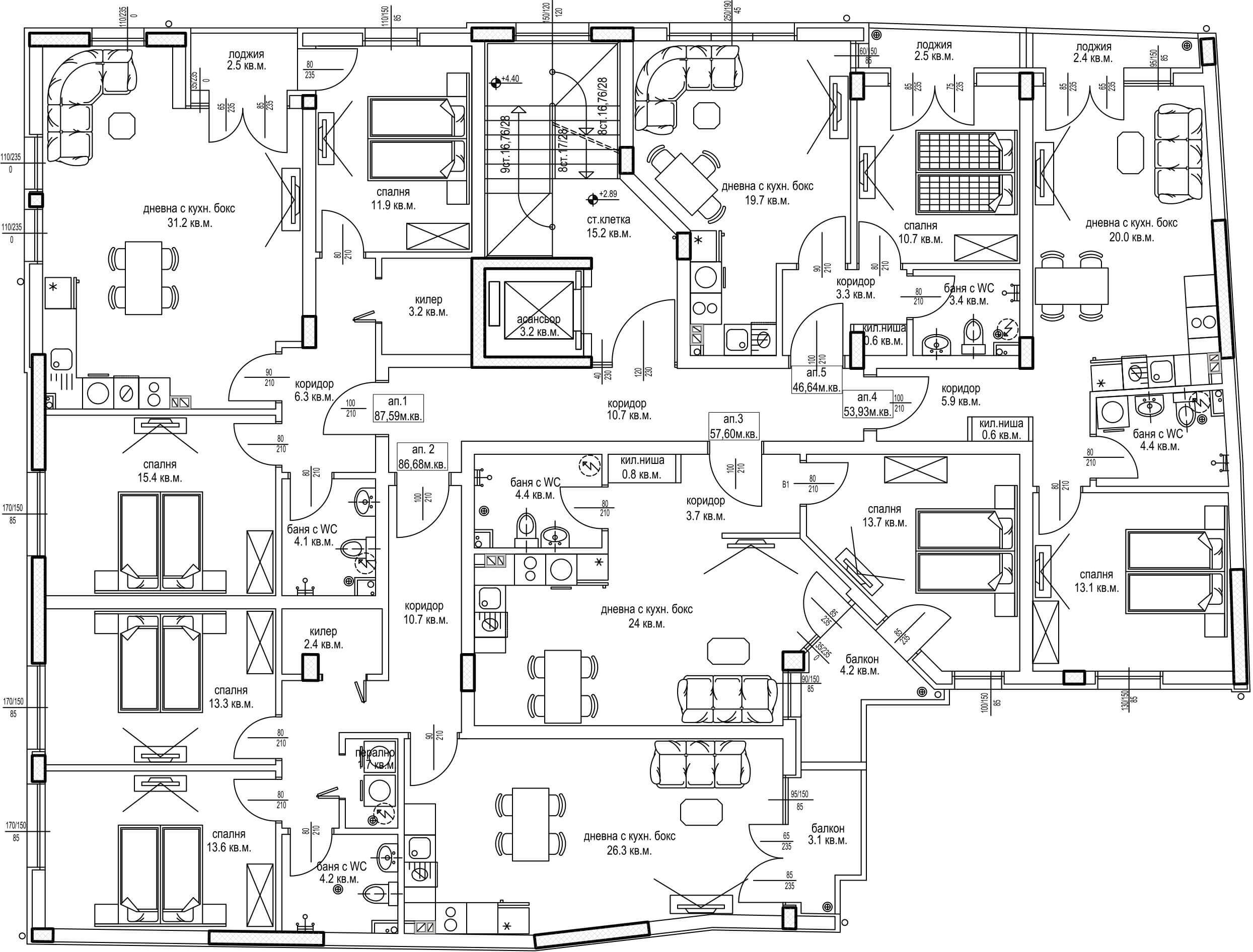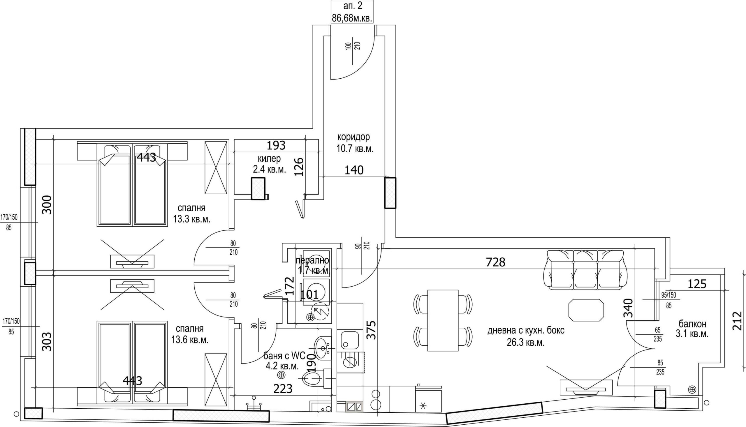 Апартамент – дневна с кухненски бокс, 2 спални, баня с тоалетна, перално, килер, коридор и балкон.