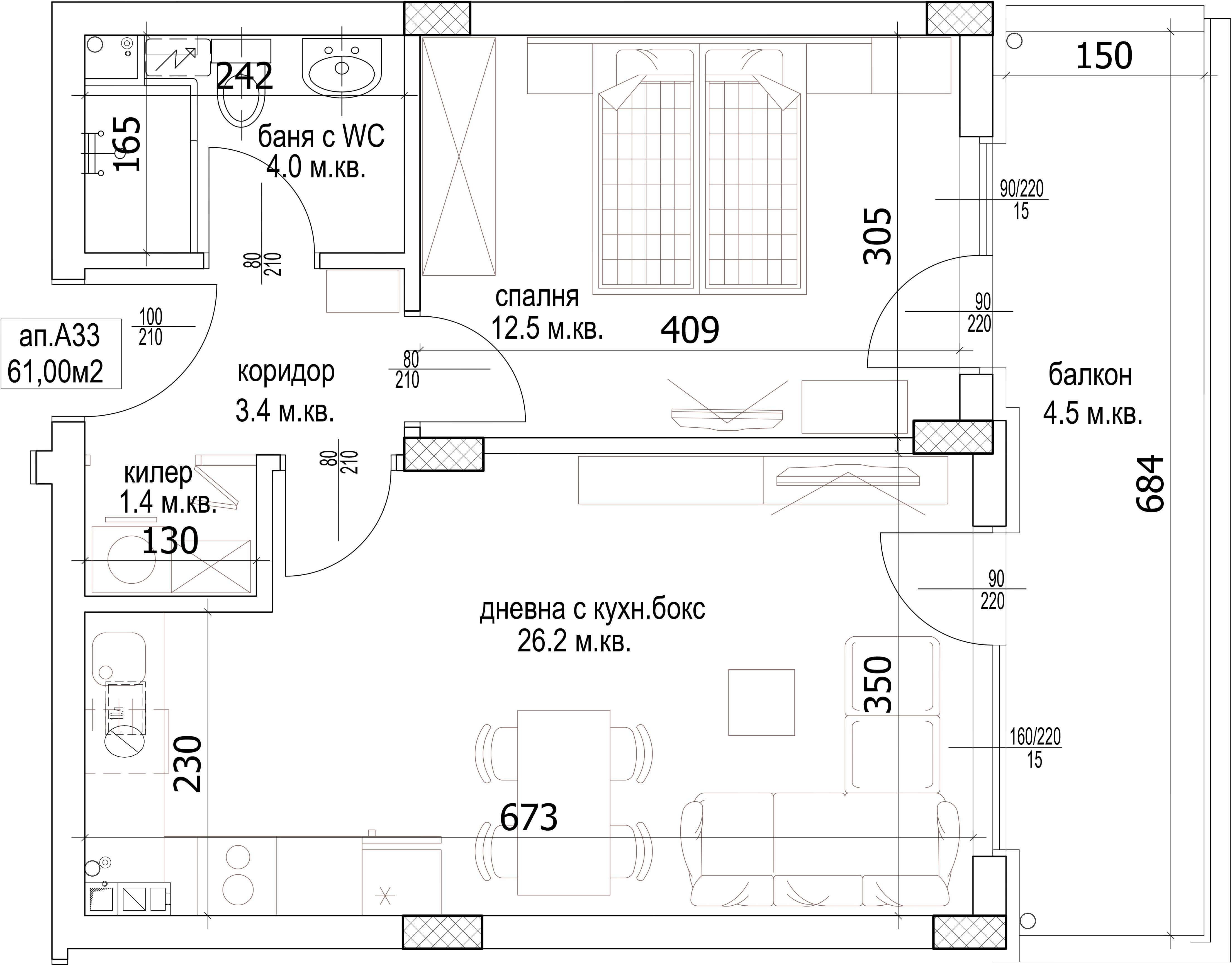 Апартамент – днесна с кухненски бокс, спалня, баня с тоалетна, килер, коридор и балкон.