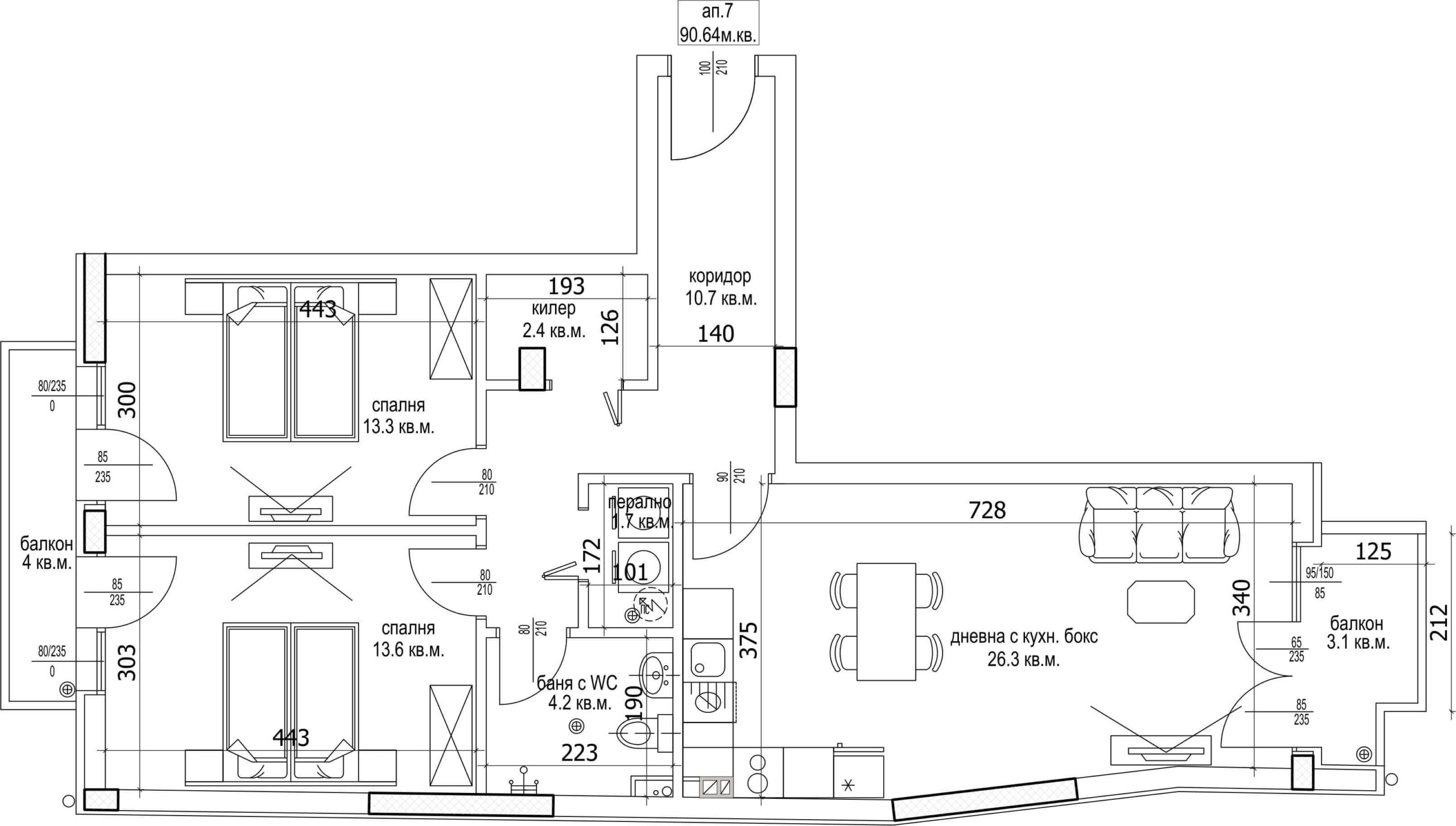 Апартамент – дневна с кухненски бокс, 2 спални, баня с тоалетна, перално, килер, коридор и 2 балкона.