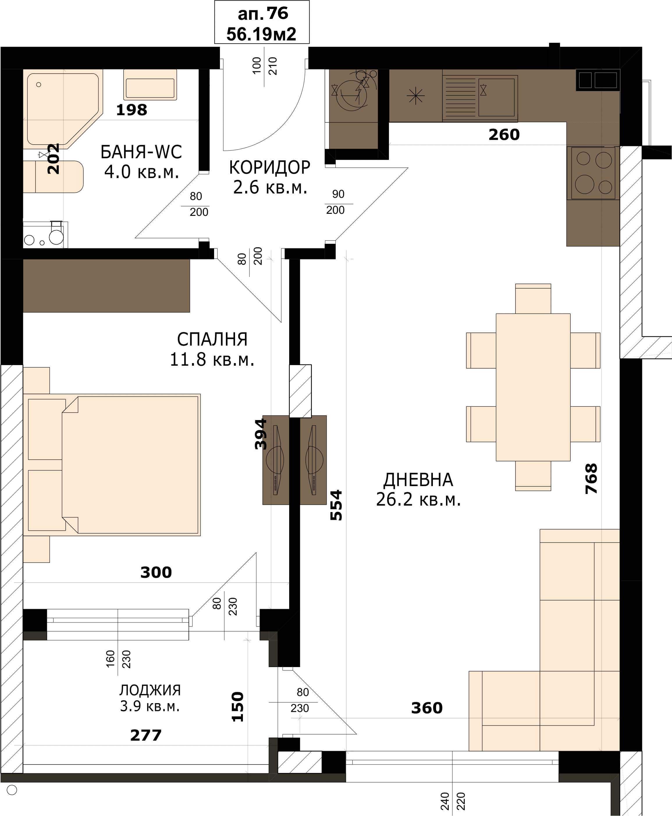 Апартамент – дневна с кухненски бокс, спалня, баня с тоалетна, килер, коридор и лоджия
