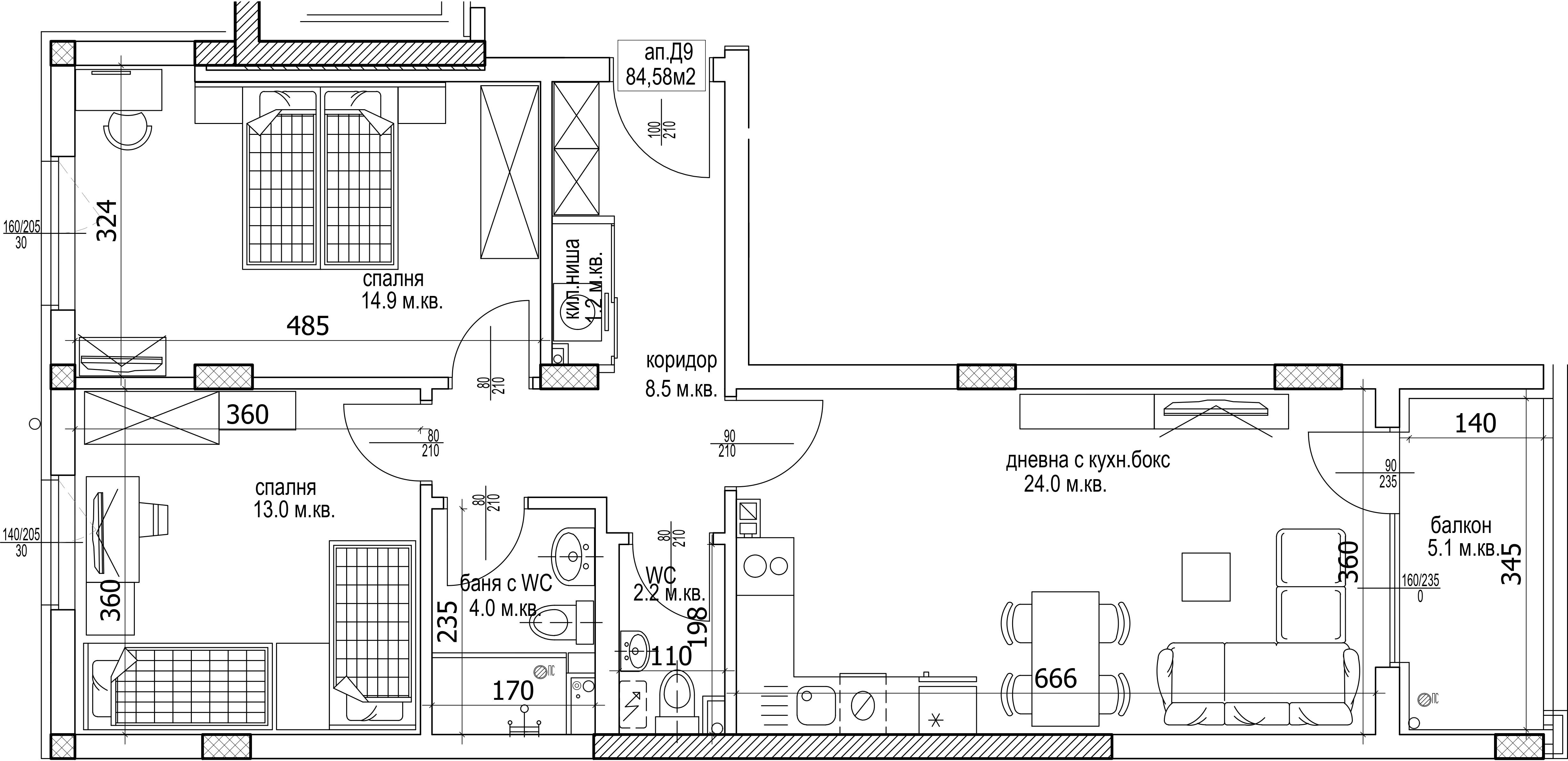 Апартамент – дневна с кухненски бокс, 2 спални, баня с тоалетна, тоалетна, килер, коридор и балкон.
