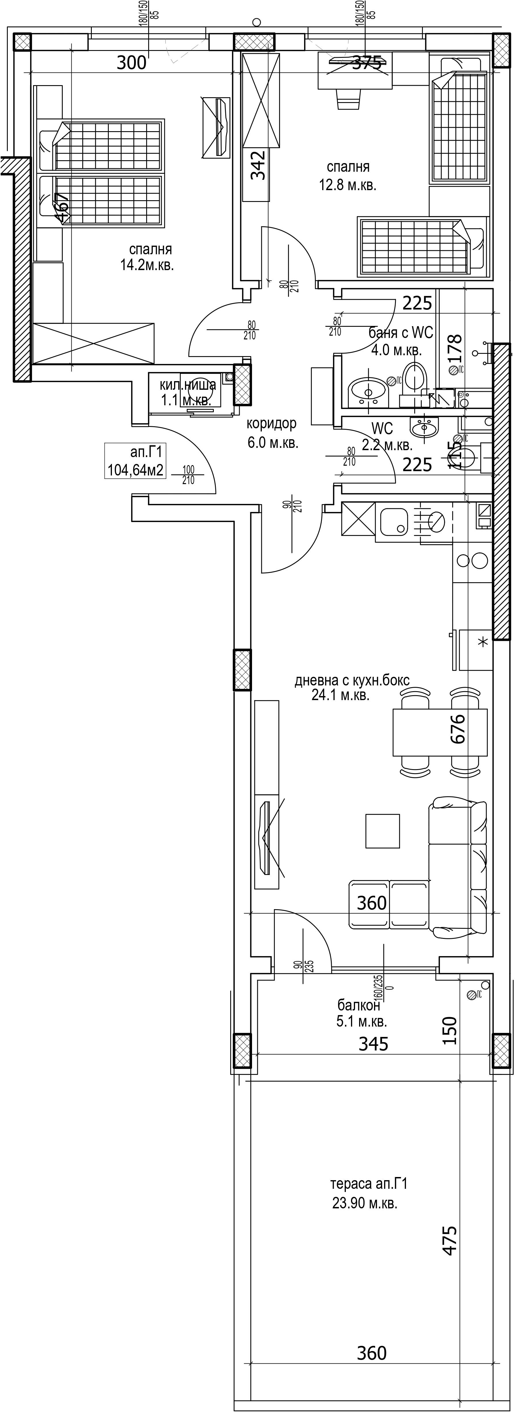 Апартамент – дневна с кухненски бокс, 2 спални, баня с тоалетна, тоалетна, килер, коридор, балкон и тераса.