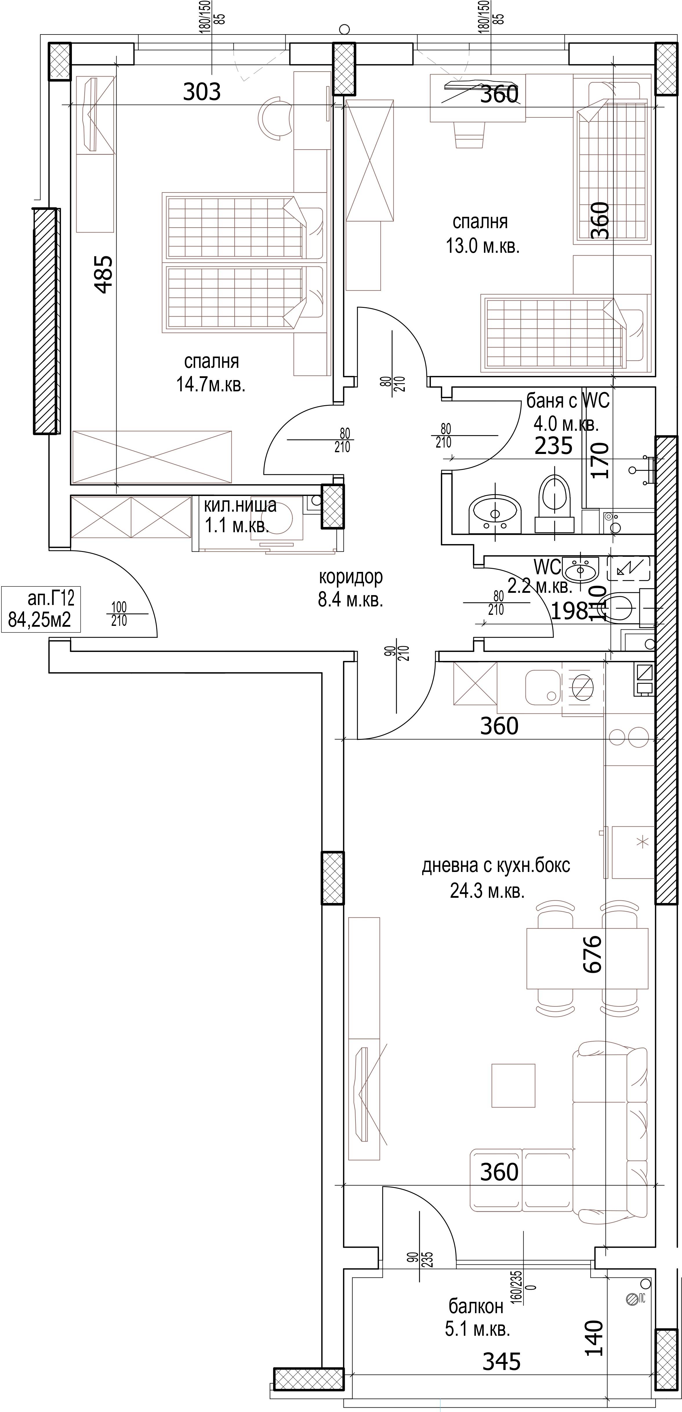 Апартамент – дневна с кухненски бокс, 2 спални, баня с тоалетна, тоалетна, килер, коридор и балкон.