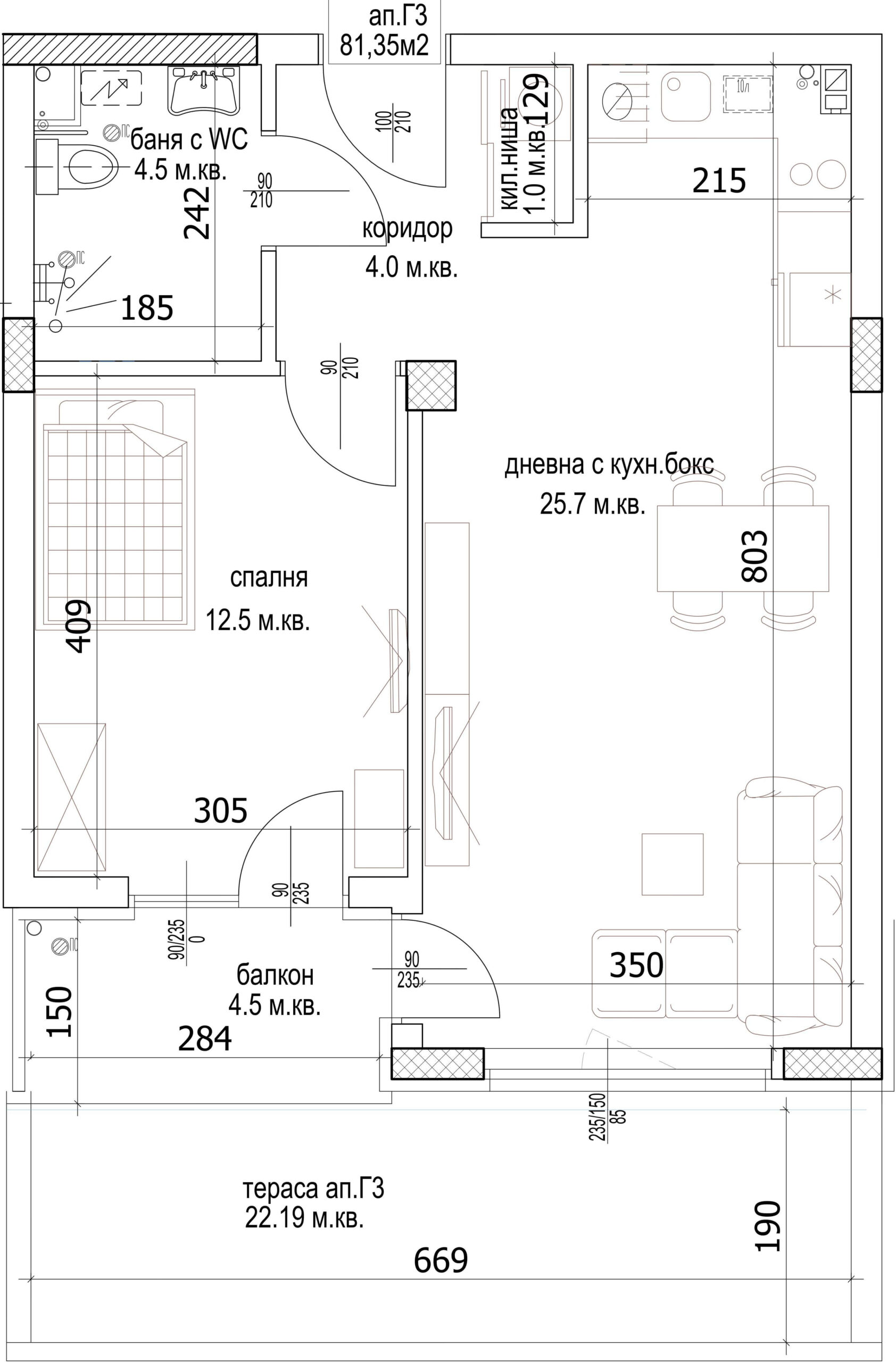 Апартамент – дневна с кухненски бокс, спалня, баня с тоалетна, килер, коридор, балкон и тераса.