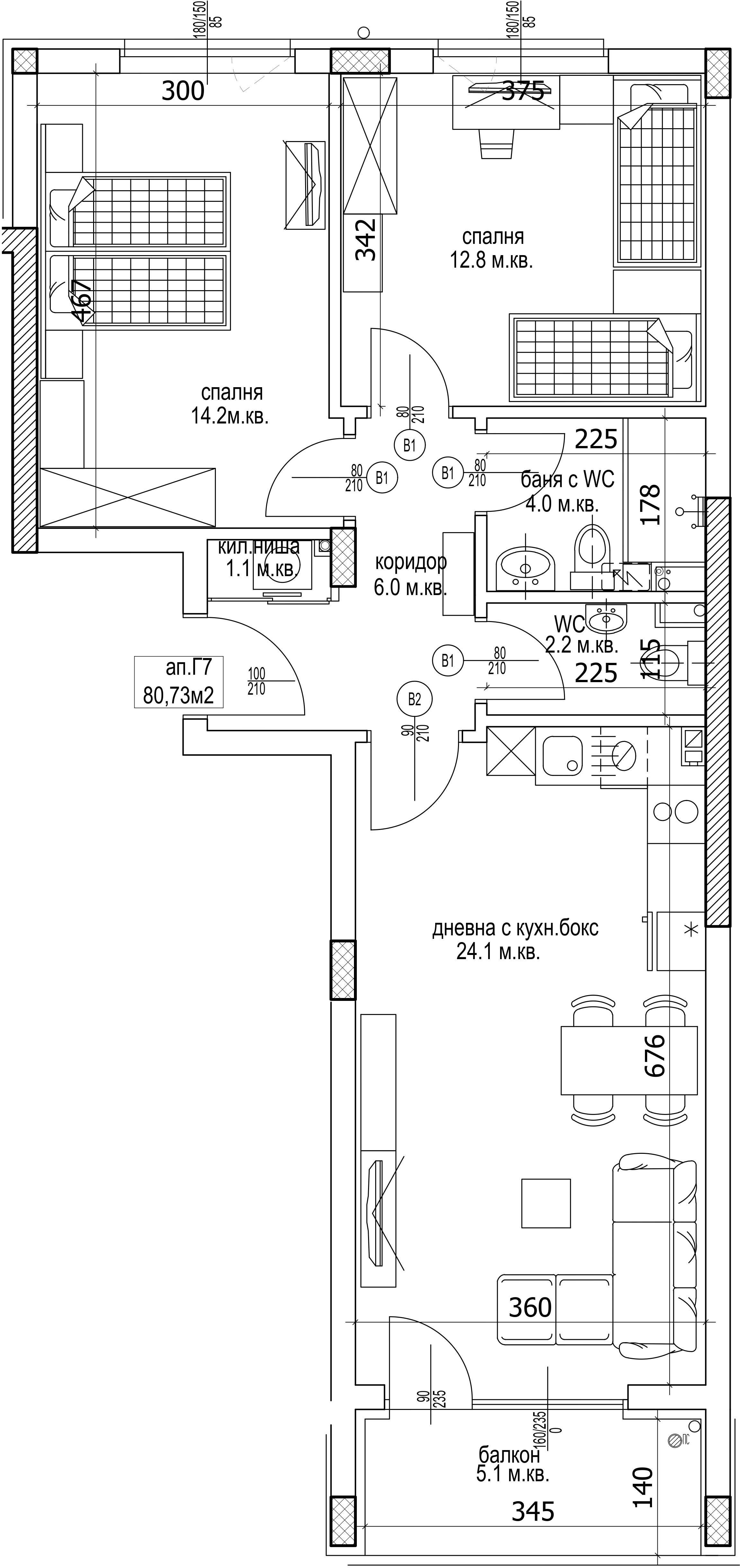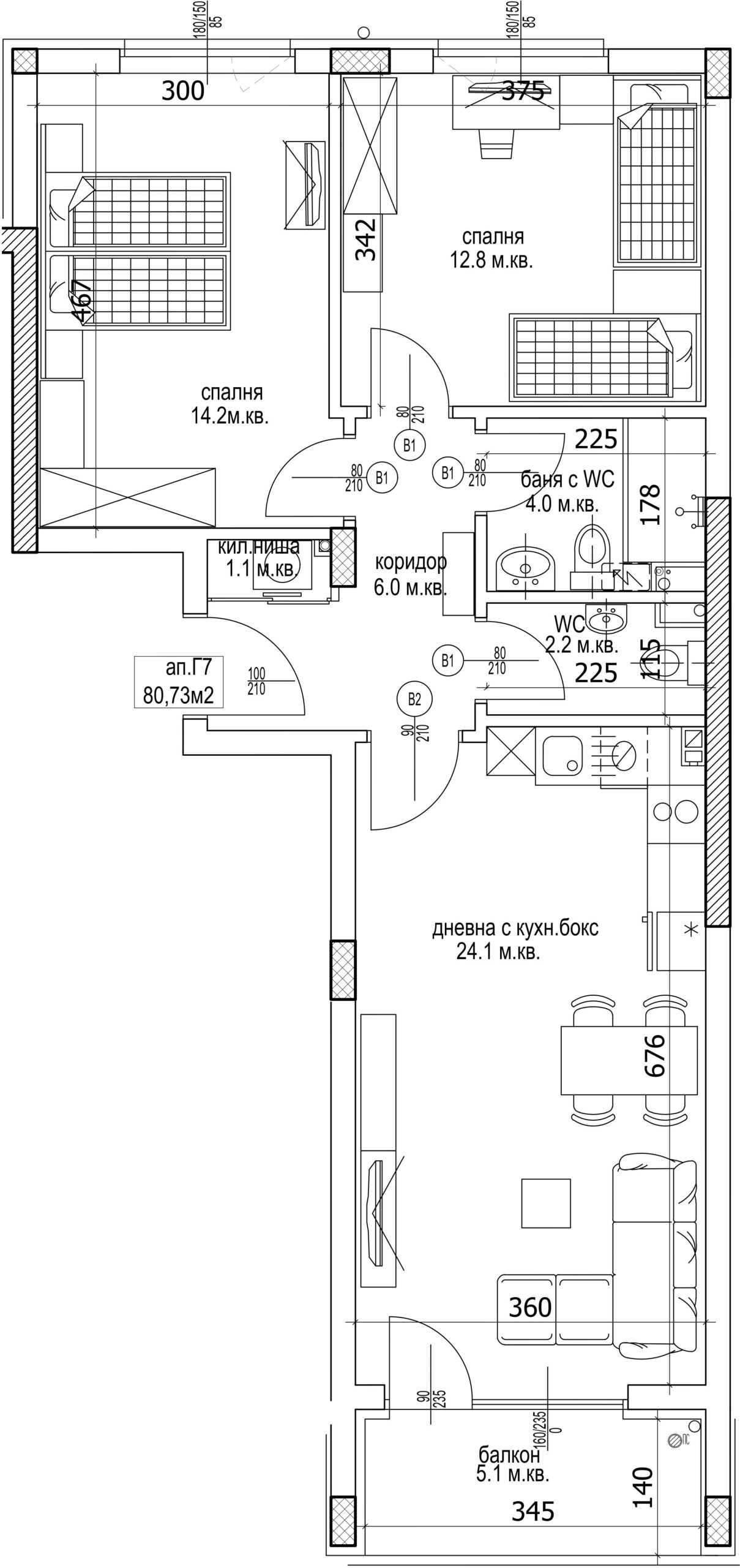 Апартамент – дневна с кухненски бокс, 2 спални, баня с тоалетна, тоалетна, килер, коридор и балкон.
