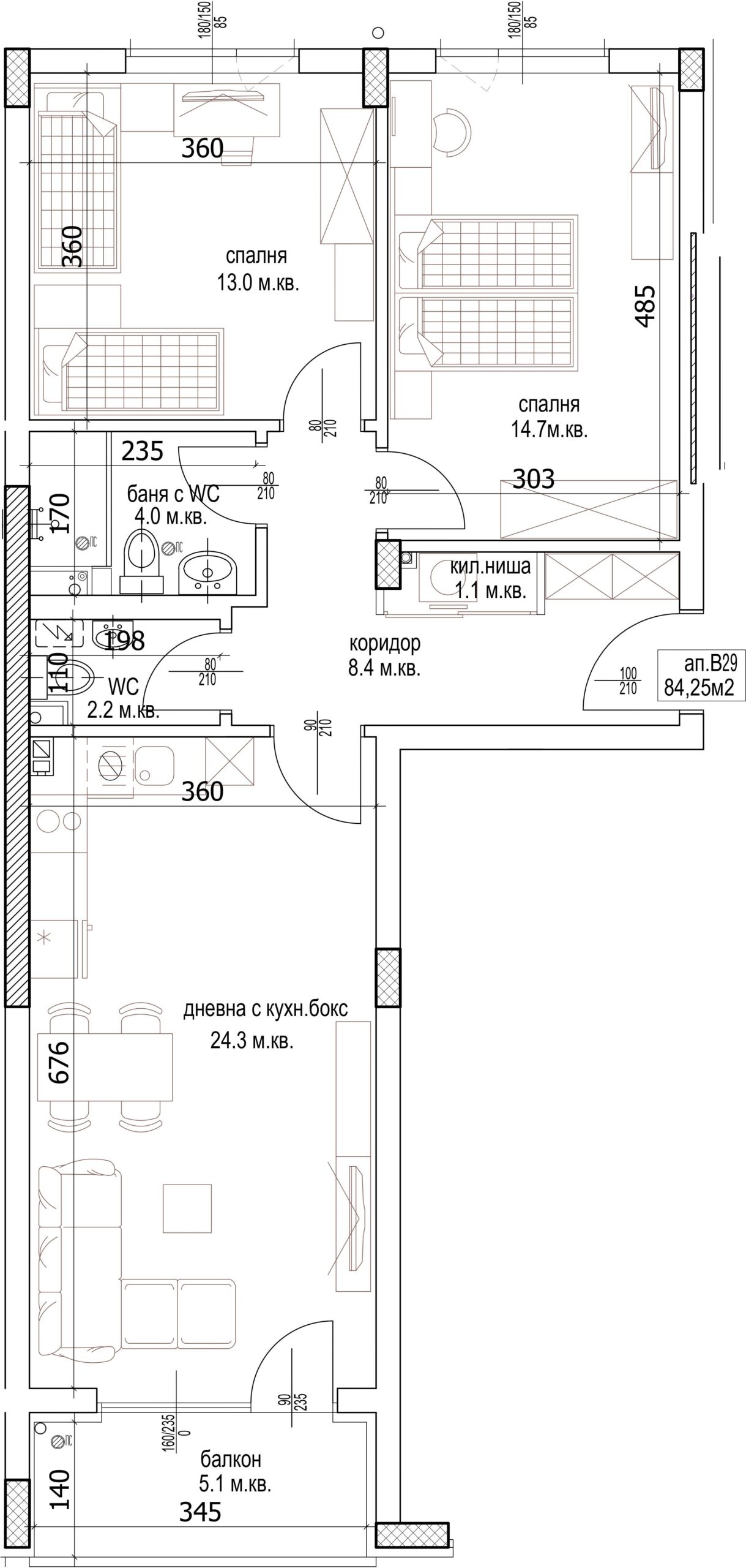 Апартамент – дневна с кухненски бокс, 2 спални, баня с тоалетна, тоалетна, килер, коридор и балкон.